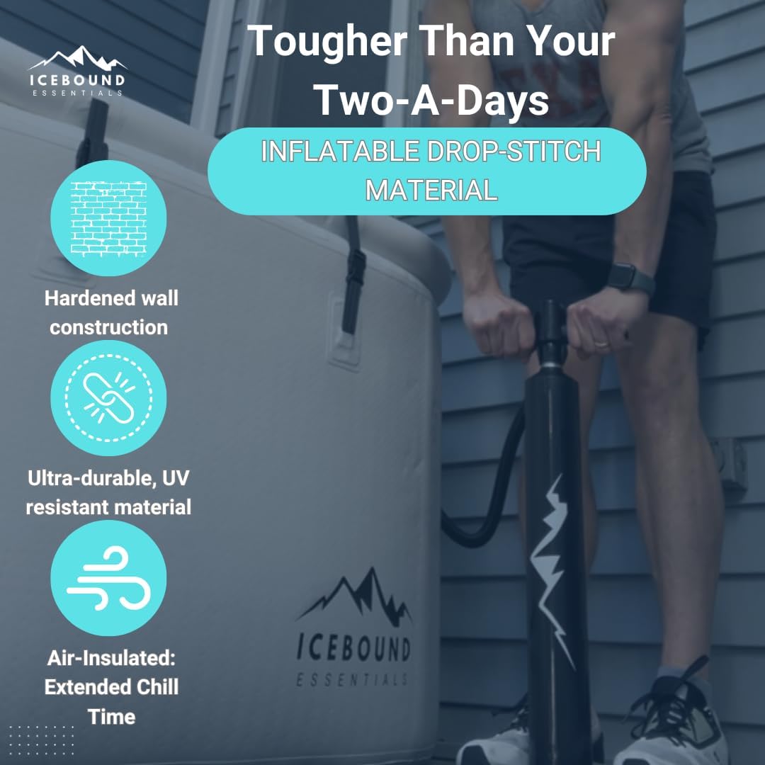 Lifetime Durability, Portable Design: Crafted from high-quality, inflatable white water raft grade material, this cold plunge tub is both sturdy and lightweight. The innovative design allows for easy setup, storage, and transportation, making it the perfect ice tub for cold plunge.