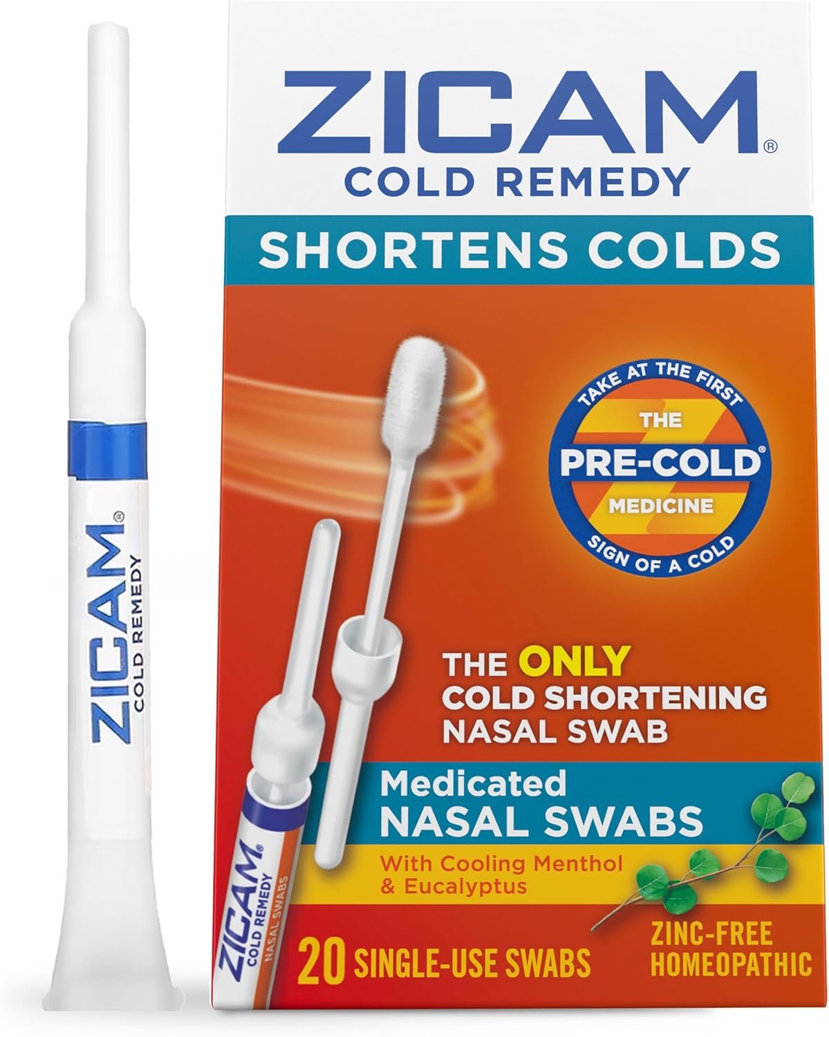 Zicam is completely different® from most other cold remedies because it actually shortens colds versus just temporarily relieving symptoms, when taken at the first sniffle, sneeze or cough. This zinc-free homeopathic formula is plant-based and contains cooling menthol & soothing eucalyptus. Zicam Cold Remedy medicated nasal swabs are the only cold shortening nasal swabs. These proprietary swabs allow for gentle application of Zicam patented gel formula in nasal passages. Active ingredients: Galphimia glauca 4x, Luffa operculata 4x, Sabadilla 4x. Box contains 20 cold shortening Zicam swabs.